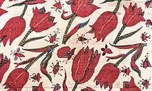 Chintz was originally a woodblock printed, painted or stained calico produced in Hyderabad, India[2] from 1600 to 1800 and popular for bed covers, quilts and draperies. After Vasco da Gama successfully reached Calicut in India in 1498, the fabric became known in Europe.[6] Around 1600, Portuguese and Dutch traders were bringing examples of Indian chintz into Europe on a small scale, but the English and French merchants began sending large quantities. By 1680 more than a million pieces of chintz were being imported into England per year, and a similar quantity was going to France and the Dutch Republic. These early imports were probably mostly used for curtains, furnishing fabrics, and bed hangings and covers (Samuel Pepys bought a set for his wife.)[7] It has been suggested that wearing them as clothes began when these were replaced and given to maidservants, who made them into dresses, and also that they were first worn as linings.