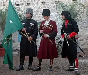 A chokha,[lower-alpha 1] also known as a cherkeska,[2] is a woolen coat with a high neck that is part of the traditional male dress of peoples of the Caucasus.[3] It was in wide use among Avars, Abazins, Abkhazians, Eastern Armenians,[4] Azerbaijanis, Balkars, Chechens, Circassians, Georgians, Ingush, Karachays, Nogais, Ossetians, Tats, the peoples of Dagestan, as well as Terek and Kuban Cossacks who adopted it from the aforementioned peoples.