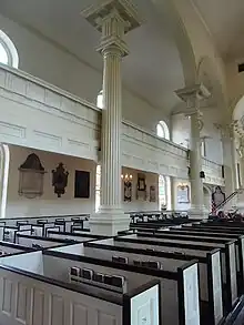 When the congregation outgrew the original building twenty years after its construction, they decided to erect a new church, the most sumptuous in the colonies. The main body of the church was constructed between 1727 and 1744, and the steeple was added in 1754, making it the tallest building in the future United States of America, at 196 feet (60 m).[5] Christ Church is considered one of the nation's most beautiful surviving 18th-century structures, a monument to colonial craftsmanship and a handsome example of Georgian architecture. Modeled on the work in London of Christopher Wren,[1] it features a symmetrical, classical façade with arched windows and a simple yet elegant interior with fluted columns and wooden pews. Although the architect of the church is unknown, its construction was supervised by John Kearsley, a physician, who was likely also responsible for the design, possibly with John Harrison.[1][6] The church was rebuilt in 1777 by Robert Smith, and the interior was altered in 1883 by Thomas Ustick Walter.[6]