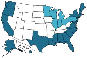 The data for method 2 is from a list maintained by the Office of Ocean and Coastal Resource Management of the National Oceanic and Atmospheric Administration (NOAA).[note 1] The state coastline lengths were computed by an unspecified method that includes tidal areas not included in the first method.[3] These numbers also include the Great Lakes coastlines, which do not have similar tidal areas. Data for the U.S. Minor Outlying Islands is from the CIA World Factbook.[4][5][6]