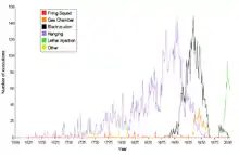 In 1982, Texas carried out the first execution by lethal injection in world history and lethal injection subsequently became the preferred method throughout the country, displacing the electric chair.[80] From 1976 to 8 December 2016, there were 1,533 executions, of which 1,349 were by lethal injection, 163 by electrocution, 11 by gas inhalation, 3 by hanging, and 3 by firing squad.[81] The South had the great majority of these executions, with 1,249; there were 190 in the Midwest, 86 in the West, and only 4 in the Northeast. No state in the Northeast has conducted an execution since Connecticut, now abolitionist, in 2005. The state of Texas alone conducted 571 executions, over 1/3 of the total; the states of Texas, Virginia (now abolitionist), and Oklahoma combined make up over half the total, with 802 executions between them.[82] 17 executions have been conducted by the federal government.[83] Executions increased in frequency until 1999; 98 prisoners were executed that year. Since 1999, the number of executions has greatly decreased, and the 17 executions in 2020 were the fewest since 1991.[15] A 2016 poll conducted by Pew Research, found that support nationwide for the death penalty in the U.S. had fallen below 50% for the first time since the beginning of the post-Gregg era.[84]