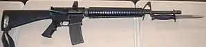 ![]() A Colt Canada C7A1 with the bayonet attached. The rear sight element is a back up iron sight (BUIS). | |