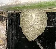 A V. vulgaris nest is made from chewed wood fibers mixed with worker saliva. It is generally made of brittle tan coloured paper. It has open cells and a cylindrical column known as a petiole attaching the nest to the substrate. The wasps produce a chemical which repels ants and secrete it around the base of the petiole, to avoid ant predation.[13]