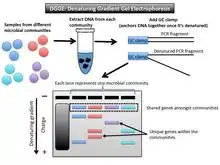 Denaturing gradient gel electrophoresis (DGGE) is a microbial fingerprinting technique that separates amplicons of roughly the same size based on sequence properties[1] (Figure 2). These properties dictate the threshold at which DNA denatures. The DGGE gel uses a gradient DNA denaturant (a mixture of urea and formamide), or a linear temperature gradient.[10] When the fragment reaches its melting point (threshold of enough denaturant), it stops moving. This is due to the fact that a partially melted double-stranded DNA can no longer migrate through the gel.[11] A GC clamp (about 40 bases with high GC content) is used as a special primer to anchor the PCR fragments together once they have denatured.[12]