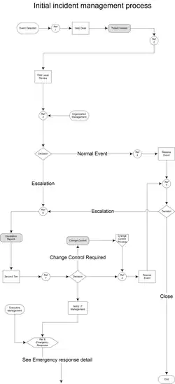 - Escalation – an escalated event affects critical production systems or requires that implementation of a resolution that must follow a change control process. Escalated events require the participation of senior personnel and stakeholder notification of the event.