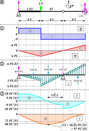 Here the shear V compares with the slope θ, the moment M compares with the displacement v, and the external load w compares with the M/EI diagram. Below is a shear, moment, and deflection diagram. A M/EI diagram is a moment diagram divided by the beam's Young's modulus and moment of inertia.