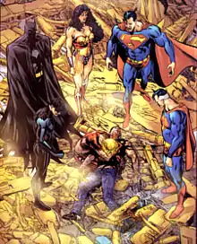 In the DC Comics' limited series Infinite Crisis, the other-dimensional Superboy-Prime watches Conner during his seclusion in the paradise dimension.[13][14][15] Along with Alexander Luthor Jr., another survivor of the previous Crisis, they wish to reconstruct the DC Universe in their image after determining that the heroes they've been observing didn't meet their own standards of what heroism really was. Resentful of Conner, whom he claims has lower standards than his own despite a seemingly perfect life, Superboy-Prime attacks him, telling him that he should be his replacement as Superboy. Possessing an apparent strength advantage, Superboy-Prime pulverizes Conner, badly injuring him, until the Teen Titans, Doom Patrol, and Justice Society of America join the fray, leading to a climactic battle where various Flashes pull Superboy-Prime into the Speed Force.[16][17]