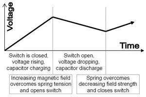 In electromechanical regulators, voltage regulation is easily accomplished by coiling the sensing wire to make an electromagnet. The magnetic field produced by the current attracts a moving ferrous core held back under spring tension or gravitational pull. As voltage increases, so does the current, strengthening the magnetic field produced by the coil and pulling the core towards the field. The magnet is physically connected to a mechanical power switch, which opens as the magnet moves into the field. As voltage decreases, so does the current, releasing spring tension or the weight of the core and causing it to retract. This closes the switch and allows the power to flow once more.