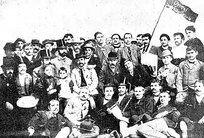 With Panait Mușoiu and Nădejde, Mille founded the magazine Munca, which was published between 1890 and 1894.[7][9] It followed in the wake of Contemporanul's 1891 disestablishment, and adhered to Dobrogeanu-Gherea's pamphlet Ce vor socialiștii români? ("What Do the Romanian Socialists Want?", 1886), which had set the tone for unifying the various socialist groups in the country.[4][9] Carrying the subtitle "Organ social democrat" ("Social democratic organ"),[9] Munca effectively relocated the center of socialist activity from Iași to Bucharest,[9] and had among its collaborators Garabet Ibrăileanu, Sofia Nădejde, and Mihai Pastia.[9] Associated with the labor movement and frequently reporting on strikes, the newspaper urged workers to organize into trade unions and popularized Marxist tenets.[7] In 1891, Nădejde, Mille and Morțun issued a manifesto of the would-be socialist party (at the time, a loose rally of socialist clubs),[9] entitled Manifest către țărani, în numele Comitetului electoral al partidului ("Manifesto to the Peasants, in the Name of the Party's Election Committee").[3]