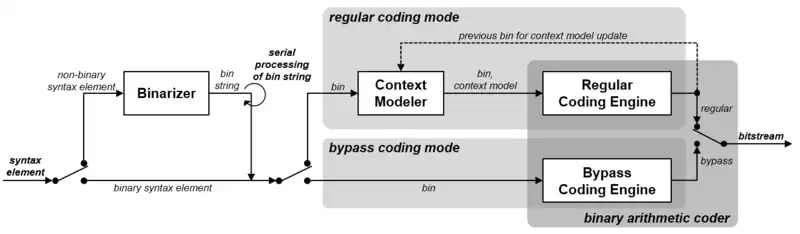 Context-adaptive binary arithmetic coding (CABAC) is a form of entropy encoding used in the H.264/MPEG-4 AVC[1][2] and High Efficiency Video Coding (HEVC) standards. It is a lossless compression technique, although the video coding standards in which it is used are typically for lossy compression applications. CABAC is notable for providing much better compression than most other entropy encoding algorithms used in video encoding, and it is one of the key elements that provides the H.264/AVC encoding scheme with better compression capability than its predecessors.[3]
