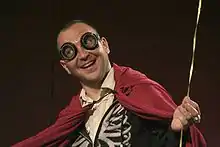 The webcomic xkcd has occasionally featured a partially fictional version of Doctorow who lives in a hot air balloon up in the "blogosphere" ("above the tag clouds") and wears a red cape and goggles, such as in the comic "Blagofaire".[82] When Doctorow won the 2007 EFF Pioneer Award, the presenters gave him a red cape, goggles and a balloon.[83]