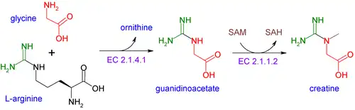 Creatine is not an essential nutrient.[24] It is an amino acid derivative, naturally produced in the human body from the amino acids glycine and arginine, with an additional requirement for S-Adenosyl methionine (a derivative of methionine) to catalyze the transformation of guanidinoacetate to creatine. In the first step of the biosynthesis, the enzyme arginine:glycine amidinotransferase (AGAT, EC:2.1.4.1) mediates the reaction of glycine and arginine to form guanidinoacetate. This product is then methylated by guanidinoacetate N-methyltransferase (GAMT, EC:2.1.1.2), using S-adenosyl methionine as the methyl donor. Creatine itself can be phosphorylated by creatine kinase to form phosphocreatine, which is used as an energy buffer in skeletal muscles and the brain. A cyclic form of creatine, called creatinine, exists in equilibrium with its tautomer and with creatine.