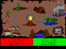 Scenarios are chosen by shooting a destination on a map screen, which include: town, desert, volcano, cave, bridge, jungle, and castle. The goal is to reach the final scenario, past the castle, in which the player confronts the Master of Darkness, who presumably created the dangers in the game. Defeating the Master of Darkness requires shooting him in the eyes when they turn red (and deadly). The player is treated to a brief congratulation and a challenge to defeat the Master of Darkness again, "IF YOU DARE". Following this screen the player starts over with however many adventurers survived the confrontation.