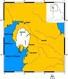 The Lake District extends to the coast of the Irish Sea from Drigg in the north to Silecroft in the south, encompassing the estuaries of the Esk and its tributaries, the Irt and the Mite. The intertidal zone of the combined estuaries includes sand, shingle and mudflats, and saltmarsh. The dune systems on either side of the estuary are protected as nature reserves; Drigg Dunes and Gullery[27] to the north and Eskmeals Dunes[28] to the south. South of the estuary, the coast is formed in low cliffs of glacial till, sands, and gravels.[29]