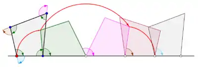 ![]() Animation showing the generation of one arch of a cyclogon by an equilateral triangle as the triangle rolls over a straight line without slipping. | ![]() Animation showing the generation of one arch of a cyclogon by a square as the square rolls over a straight line without slipping. |