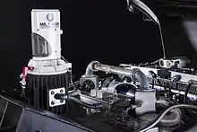 Three DeLoreans used were purchased from a collector—one for stunts, one for special effects, and one for normal shots.[28][30] They were unreliable and often broke down.[22] 88 mph (142 km/h) was chosen as the time travel speed because it was easy to remember and looked "cool" on the speedometer.[31] A custom speedometer was built to simulate 88 mph, as a 1979 law passed by then-President Jimmy Carter had limited speedometers to 85 mph to reduce speeding.[29] The Flux Capacitor, necessary for time travel, was called the Temporal Field Capacitor; Zemeckis said the name was not believable. From his work on the 1979 drama The China Syndrome, Fink had learned of Neutron flux. He and Zemeckis simultaneously suggested renaming it the Flux Capacitor. Cobb and Probert had already placed the Flux Capacitor on the external and interior roof of the DeLorean. Fink placed it next to the driver.[27] Fink constructed the device using a NEMA box and backlit Torr High-Voltage relays. The time display was constructed from LMB boxes. When Fink left, he picked Michael Scheffe to replace him. Scheffe finished the Flux Capacitor build and built the "Mr. Fusion" replacement power supply out of a Krups coffee grinder.[27]