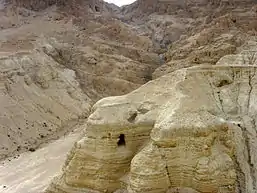Many thousands of written fragments have been discovered in the Dead Sea area. They represent the remnants of larger manuscripts damaged by natural causes or through human interference, with the vast majority holding only small scraps of text. However, a small number of well-preserved and near-intact manuscripts have survived — fewer than a dozen among those from the Qumran Caves.[1] Researchers have assembled a collection of 981 different manuscripts (discovered in 1946/1947 and in 1956) from 11 caves,[5] which lie in the immediate vicinity of the Hellenistic Jewish settlement at the site of Khirbet Qumran in the eastern Judaean Desert, in the West Bank.[6] The caves are located about 1.5 kilometres (1 mi) west of the northwestern shore of the Dead Sea, whence they derive their name. Archaeologists have long associated the scrolls with the ancient Jewish sect known as the Essenes, although some recent interpretations have challenged this connection and argue that priests in Jerusalem, or Zadokites, or other unknown Jewish groups wrote the scrolls.[7][8]