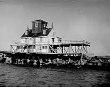 Delaware Breakwater West End Lighthouse was built in 1838. In 1881 this light became the front light of the Delaware Breakwater Range. When this light was deactivated in 1903, the Delaware Breakwater West End Light became the front light in the range. The unoccupied house was destroyed in 1950.