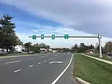 The Christiana Parkway around the southern edge of Newark was completed in September 1983.[24][25] By 1990, DE 2 was realigned to bypass Newark along Christiana Parkway, which also carried portions of DE 4 and DE 896, Chestnut Hill Road, which also carried DE 4, and South Chapel Street and Library Avenue, which was also DE 72. With this realignment, the former route through Newark became DE 2 Bus.[26] In 2013, the Delaware Department of Transportation (DelDOT) proposed the renumbering of routes in and around Newark. The plan called for DE 2 to start at DE 273 (Main Street) east of Newark instead of at the Maryland state line as well as the removal of the DE 2 Bus. designation through Newark. In addition, the portion of Elkton Road between the Maryland state line and DE 4/DE 896 (Christiana Parkway) was to be designated as DE 279. The goal of the project was to "simplify the route designations in Newark, reduce sign clutter, and reduce sign maintenance costs." The changes were completed in the middle part of 2013.[27] In September 2015, the concurrency with DE 41 in Prices Corner was removed when the southern terminus of DE 41 was cut back from the interchange with DE 141 to the intersection with DE 2 and DE 62.[28][29]