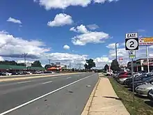 Delaware Route 2 Business (DE 2 Bus.) was a 2.91-mile (4.68 km)[1] long business route of DE 2 that ran through the city of Newark. The business route ran northeast from its western terminus at an intersection with DE 2/DE 4/DE 896 southwest of downtown Newark along four-lane divided Elkton Road, concurrent with DE 896. From this point, DE 2 Bus./DE 896 crossed the Christina River and headed into residential areas. The road changed names to South Main Street and became undivided as it passed businesses before reaching downtown Newark. Here, DE 2 Bus./DE 896 intersected DE 273, with the road splitting into a one-way pair. Eastbound DE 2 Bus./northbound DE 896 ran concurrent with eastbound DE 273 on West Delaware Avenue, heading to the east, while westbound DE 2 Bus./southbound DE 896 remained along South Main Street, also concurrent with eastbound DE 273. The one-way pair carried two lanes in each direction. Westbound DE 2 Bus. entered South Main Street from West Main Street, which also carried the westbound direction of DE 273 and the northbound direction of DE 896. At the intersection with South College Avenue, the concurrency in both directions with northbound DE 896 ended. DE 2 Bus./DE 273 passed through the University of Delaware campus and continued through the commercial downtown as East Delaware Avenue eastbound and East Main Street westbound. Farther east, the one-way pair crossed the Pomeroy and Newark Rail Trail and passed the Newark Transit Hub serving DART First State buses, which is located between East Main Street and East Delaware Avenue. East Delaware Avenue shifted farther to the south of East Main Street, with the one-way streets running between a residential neighborhood and East Delaware Avenue heading to the north of Newark High School. Past here, the route came to an intersection with DE 2/DE 72. At this point, DE 2 Bus. ended and eastbound DE 273 headed north with DE 2/DE 72 to rejoin westbound DE 273.[30][31]