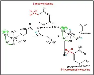 In particular, 5-methylcytosines in DNA can be demethylated by TET enzymes as illustrated in the figure. TET enzymes are dioxygenases in the family of alpha-ketoglutarate-dependent hydroxylases. A TET enzyme is an alpha-ketoglutarate (α-KG) dependent dioxygenase that catalyses an oxidation reaction by incorporating a single oxygen atom from molecular oxygen (O2) into its substrate, 5-methylcytosine in DNA (5mC), to produce the product 5-hydroxymethylcytosine in DNA. This conversion is coupled with the oxidation of the co-substrate α-KG to succinate and carbon dioxide (see figure).