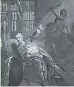 Just outside the entrance to the wood was a small hermitage known as The Temple of Death.[12] It had a thatched roof and internal enclosures formed by fake stonework panels,[15] each covered in verses reminding the reader of "the vanity, the shortness and insufficiency of human pleasures".[16] To the right-hand side of the temple entrance, hidden out of sight, was a clock that chimed every minute, which in the words of William Bowyer, was "admonishing us that Time is fleeting, and even the least portion of it to be employed in reflections on Eternity";[16][17] it was faced on the opposite side by a large white raven with a label in its mouth conveying the same message.[12] Chained to a sloping desk in the centre of the temple was a copy of Edward Young's poem Night-Thoughts and Robert Blair's The Grave, bound in black leather.[12]