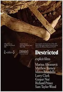 Destricted is a British-American 2006 anthology film that explores the line where art and pornography intersect. The UK and US film releases had overlapping but different short art-house erotic films. The film collection won awards at a range of international film festivals, including Cannes, Sundance, Edinburgh, Amsterdam and Locarno.[1]