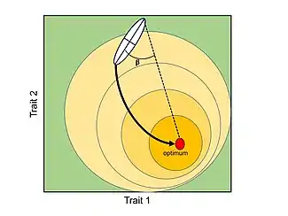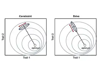 A general consequence of the P-matrices and G-matrices is that evolution will tend to follow the ‘path of least resistance’. In other words, if the main axis of variation is aligned with the direction of selection, covariation (genetic or phenotypic) will facilitate the rate of adaptive evolution; however, if the main axis of variation is orthogonal to the direction of selection, covariation will constraint the rate of adaptive evolution.[2][12][24] In general, for a population under the influence of a single fitness optimum, the rate of morphological divergence (from an ancestral to a new phenotype or between pairs of species) is inversely proportional to the angle formed by the main axis of variation and the direction of selection, causing a curved trajectory through the morphospace.[33]