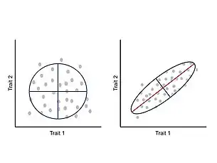 Representation of the relationship between two traits. Left: No trait covariation. Each trait changes independently of the other. Right: Trait covariation causes a positive correlation between traits where increase in one trait is correlated with an increase in the other trait (covariation can also produce negative correlation). The red line within the ellipse represents the main eigenvector of the variance-covariance matrix.