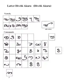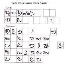 Dhives Akuru developed from Brahmi. The oldest attested inscription bears a clear resemblance to South Indian epigraphical records of the sixth-eighth centuries, written in local subtypes of the Brahmi script. The letters on later inscriptions are clearly of the cursive type, strongly reminding of the medieval scripts used in Sri Lanka and South India such as Sinhala, Grantha and Vatteluttu. There are also some elements from the Kannada-Telugu scripts.[2][3]