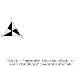 There are no mirror reflection (m) operations for the dichromatic triangle, as there would be if all the smaller component triangles were coloured white. However, by introducing the anti-mirror reflection (m') operation the full dihedral D3 symmetry is restored. The six operations making up the dichromatic D3 (3m') point group are: