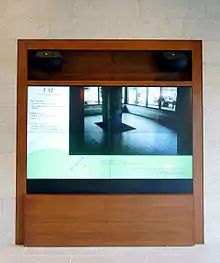Video walls are sometimes found in control rooms, stadiums, and other large public venues. Examples include the video wall in Oakland International Airport's baggage claim,[11] where patrons are expected to observe the display at long distances, and the 100 screen video wall at McCarran International Airport, which serves as an advertising platform for the 40 million passengers passing through airport annually.[12] Video walls can also benefit smaller venues when patrons may view the screens both up close and at a distance, respectively necessitating both high pixel density and large size. For example, the 100-inch video wall located in the main lobby of the Lafayette Library and Learning Center has enough size for the distant passerby to view photos while also providing the nearby observer enough resolution to read about upcoming events.[13]