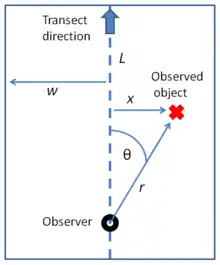 Basic distance sampling survey approach using line transects. A field observer detects an object and records distance r and angle θ to the transect line. This allows calculation of object distance to the transect (x). All x from the survey are used to model how detectability decreases with distance from the transect, which allows estimation of total population density in the surveyed area.