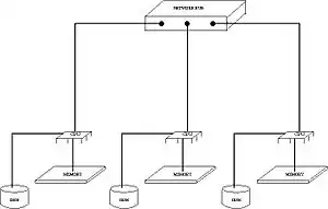 An illustration of a distributed memory system of three computers.