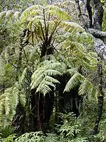 In Korsaröd there where found frashwater algae that suggest also a river influence.[104] The data provided by the fossilized wood rings showed that the location of Korsaröd hosted a middle-latitude Mediterranean-type biome in the late Early Jurassic, with low rainfall. Superimposed on this climate were the effects of a local active Strombolian Volcanism and hydrothermal activity. This location has been compared with modern Rotorua, New Zealand, considered an analogue for the type of environment represented in southern Sweden at this time. The locality was populated mostly by Cupressaceae trees (including specimens up to 5 m in circunference), known thanks to the great abundance of the wood genus Protophyllocladoxylon and the high presence of the genus Perinopollenites elatoides (also Cupressaceae) followed by Eucommiidites troedsonii (Erdtmanithecales).[80] Volcanogenic deposits are dominated by cypress family pollen with an understorey component rich in putative Erdtmanithecales, both representing vegetation of disturbed habitats. The abundance of Protophyllocladoxylon sp. is also related with a sporadic intraseasonal and multi-year episodes of growth disruption, probably due to the volcanic action, with rapid permineralization of woody remains, suggesting that the vegetation grew in a hydrothermal region, with major challenges for roots to cope with warm, mineral-laden fluids percolating through the soil.[105] Pollen, spores, wood and charcoal locally indicate a complex forest community subject to episodic fires and other forms of disturbance in an active volcanic landscape under a moderately seasonal climate.[106] Osmundastrum pulchellum, the best preserved fossil identified in this unit (whose rhizome hosts epiphytes, micro-herbivores, parasites, saprotrophs and fine organic remains) were a prominent understorey element in this vegetation and were probably involved in various competitive interactions with neighboring plant species, such as Lycophytes, whose roots have been recovered inside the Rhizome.[106] The ferns where part of a fern and conifer rich vegetation occupying a topographic depression in the landscape (moist gully) that was engulfed by one or more lahar deposits.[106]