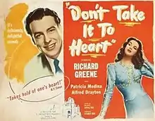 Don't Take It to Heart is a 1944 British comedy film directed by Jeffrey Dell and starring Richard Greene, Alfred Drayton, Patricia Medina, Moore Marriott and Richard Bird.[1]