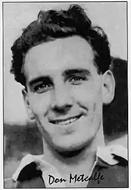 Donald "Don" Metcalfe (15 July 1932[1] – 7 November 2006) was an English rugby union, and professional rugby league footballer who played in the 1950s and 1960s, and coached rugby league in the 1960s. He played club level rugby union (RU) for Sandal RUFC,[2] and representative level rugby league (RL) for England (Under-21s), and Yorkshire (captain), and at club level for Featherstone Rovers (Heritage No. 331) (captain), and Wakefield Trinity (Heritage No. 637), as a fullback, or centre, i.e. number 1, or, 3 or 4,[3] and coached at club level for Keighley.