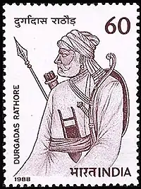 Durgadas Rathore (13 August 1638 – 22 November 1718) was the Rathore Rajput General of the Kingdom of Marwar. He is credited with having preserved the rule of the Rathore dynasty over Marwar, India, following the death of Maharaja Jaswant Singh in the 17th century. In doing so he had to defy Aurangzeb, a Mughal emperor. He commanded the Rathore forces during the Rajput War (1679–1707) and played a major role in the Rajput Rebellion (1708–1710) which became one of the main reason of decline of Mughal Empire. He was elected as the leader of the revolt along with Raja Jai Singh II of Jaipur.[1] He won a number of victories against the Mughals[2] and forced many Mughal officers to pay tribute to him in the form of chauth.[3]