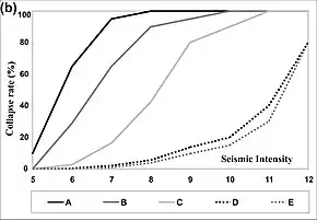 The probability that a building of a given type may collapse if subjected to a certain intensity of shaking (Figure 5) is an important parameter for calculating expected human losses. The weak buildings that are present in developing countries (Figure 4 on the left) are the ones that are likely to collapse at moderate intensities (Figure 5 on the left).