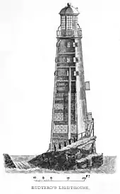 Rudyard's lighthouse, in contrast to its predecessor, was a smooth conical tower, shaped 'so as to offer the least possible resistance to wind and wave'.[13] It was built on a base of solid wood, formed from layers of timber beams, laid horizontally on seven flat steps which had been cut into the upper face of the sloping rock. On top of this base rose several courses of stone, interspersed with further layers of wood, which was designed to serve as ballast for the tower. This substructure rose to a height of 63 feet (19 m), on top of which were raised four storeys of timber. The entire structure was sheathed in vertical wooden planks and anchored to the reef using 36 wrought iron bolts, forged to fit deep dovetailed holes which had been cut in the reef.[14] The vertical planks were installed by two master-shipwrights from Woolwich Dockyard and were caulked like those of a ship.[9] The tower was topped with an octagonal lantern, which brought it to a total height of 92 feet (28 m).[13] A light was first shone from the tower on 8 August [O.S. 28 July] 1708[15][16] and the work was completed in 1709. The light was provided by 24 candles.[9] Rudyard's lighthouse proved more durable than its predecessor, surviving and serving its purpose on the reef for nearly 50 years.[5]