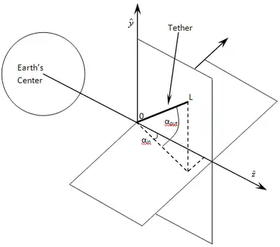 where the angle τ is between the length vector (L) of the tether and the electric field vector (E), assumed to be in the vertical direction at right angles to the velocity vector (v) in plane and the magnetic field vector (B) is out of the plane.