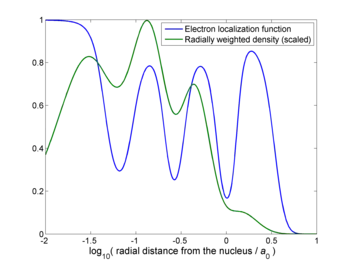 ELF's usefulness stems from the observation that it allows electron localization to be analyzed in a chemically intuitive way. For example, the shell structure of heavy atoms is obvious when plotting ELF against the radial distance from the nucleus; the ELF for radon has six clear maxima, whereas the electronic density decreases monotonically and the radially weighted density fails to show all shells. When applied to molecules, an analysis of the ELF shows a clear separation between the core and valence electron, and also shows covalent bonds and lone pairs, in what has been called "a faithful visualization of VSEPR theory in action".[1] Another feature of the ELF is that it is invariant concerning the transformation of the molecular orbitals.