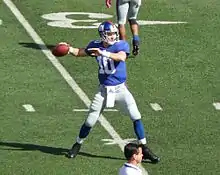 Manning finished among the top five quarterbacks in both passing yards and touchdown passes, while leading an offense that finished third in the NFL in scoring with a total of 422 points.[98][99] It was the most points the Giants scored in a single season since 1963.[100] The Giants won the NFC East with an 11–5 record[101] and advanced to the postseason as the #4-seed.[102] In the Wild Card Round against the Carolina Panthers, Manning was 10-of-18 for 113 yards and three interceptions in the 23–0 loss.[103]
