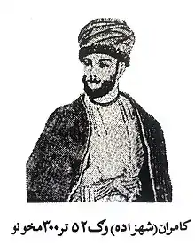 When Kamran Shah returned from Qandahar, Mahmud refused to let him back in. As a result, Kamran, with the support of the Qandahar Sardars, besieged Herat.[5] Mahmud then recruited the help of Saleh Khan, who sent Mustafa Khan Zori to break the siege of the city. They were successful, but Mustafa Khan then turned against his allies, imprisoned Saleh Khan, and forced Mahmud Shah out the city. However, Kamran and Mahmud Shah then united against Mustafa Khan and within a month[15] deposed him. In the winter of 1824 Mustafa Khan was executed.[5] Kamran Mirza put a paper hat on Mustafa Khan's head and then poured lamp oil on top of it.[14] In the Islamic year 1240 (August 1824 to August 1825), Mahmud Shah marched into Jamshidi lands and occupied Bala Murghab.[14]