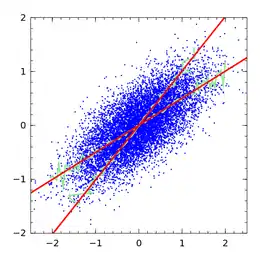 • The geometric mean functional relationship. This treats both variables as having the same reliability. The resulting slope is the geometric mean of the ordinary least squares slope and the reverse least squares slope, i.e. the two red lines in the diagram.[13]