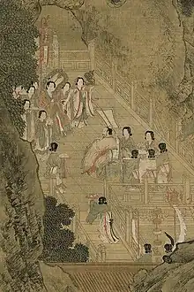 The Queen Mother of the West is most often depicted holding court within her palace on the mythological Mount Kunlun, usually supposed to be in western China (a modern Mount Kunlun is named after this). Her palace is believed to be a perfect and complete paradise, where it was used as a meeting place for the deities and a cosmic pillar where communications between deities and humans were possible.[10] At her palace she was surrounded by a female retinue of prominent goddesses and spiritual attendants. One of her symbols is the Big Dipper.[11][12]