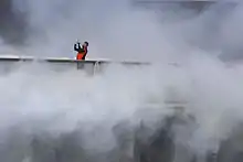 Along the publicly accessible bridge connecting Piers 15 and 17, artist Fujiko Nakaya created an installation called Fog Bridge #72494 that creates bursts of fog for six minutes every half-hour as the first in a series of large-scale temporary installations called Over the Water.[49] The Fog Bridge is 150 feet (46 m) long and makes use of 800 nozzles to create the fog, which Nakaya hopes will inspire visitors to pay attention to the nature of one of San Francisco’s best-known weather patterns. Although originally slated to be temporary, it is now on permanent display. A desalination system, located in Pier 17, conditions bay water for use in the artwork.[50][51]