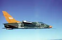 The F-100F two-seat trainer was accepted into USAF service in January 1958.[37] It received many of the same weapons and airframe upgrades as the F-100D, including the new afterburners. Various modifications, largely focused on the structure, were made during the F-100F's service life; several were adapted with special equipment for electronic warfare operations and saw use in this capacity in Vietnam.[38] By June 1970, 74 F-100Fs had been lost in major accidents. The model was phased out of USAF service in 1972.[39]