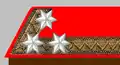 The rank insignia was a gorget patch on the stand-up collar of the so-called Waffenrock (tunic), and consisted of three white stars on 13 mm ragged yellow silk galloon. The gorget patch and the stand-up collar showed the particular Waffenfarbe (corps colour).