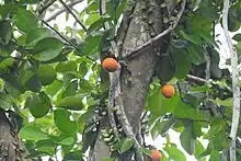 Ficus punctata of the Mulberry Family (Moraceae) is a lesser-known climbing liana or groundcover reported from Myanmar, the Andaman-Nicobar Archipelago, Thailand, Indochina, Malaysia, and Indonesia with remarkable ornamental value.[1] It is a handsome woody liana with spectacular white spotted orange or red fruits.[2] This taxon occurs in disturbed forests and rarely along the edges of the evergreen forests. This species has remarkable ornamental value and can be introduced in gardens. This Ficus can be identified in the field by its climbing habit, presence of milky latex, rhomboidal obovate coriaceious leaves, and beautiful spotted crimson-orange fruits.
